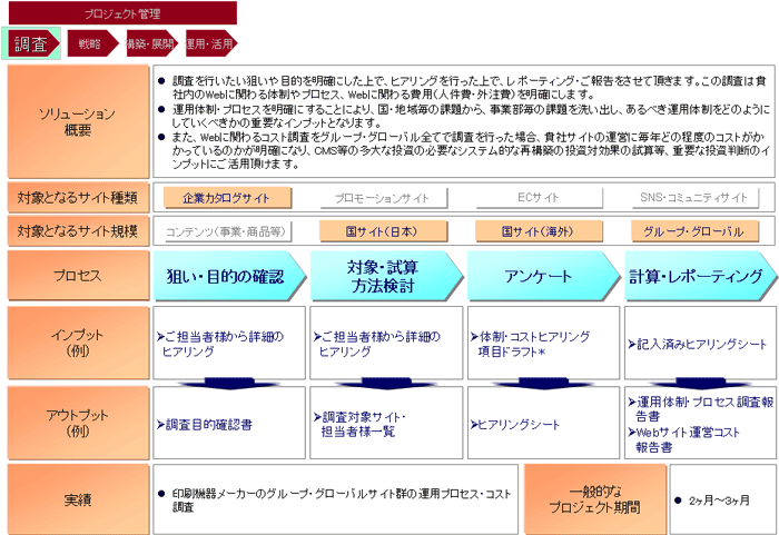 調査を行いたい狙いや目的を明確にした上で、ヒアリングを行った上で、レポーティング・ご報告をさせて頂きます。 この調査は貴社内のWebに関わる体制やプロセス、Webに関わる費用(人件費・外注費)を明確にします。 運用体制・プロセスを明確にすることにより、国・地域毎の課題から、事業部毎の課題を洗い出し、あるべき運用体制をどのようにしていくべきかの重要なインプットとなります。 また、Webに関わるコスト調査をグループ・グローバル全てで調査を行った場合、貴社サイトの運営に毎年どの程度のコストがかかっているのかが明確になり、CMS等の多大な投資の必要なシステム的な再構築の投資対効果の試算等、重要な投資判断のインプットにご活用頂けます。
