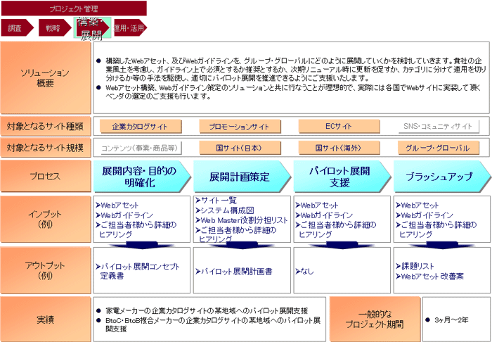 構築したWebアセット、及びWebガイドラインを、グループ・グローバルにどのように展開していくかを検討していきます。 貴社の企業風土を考慮し、ガイドライン上で必須とするか推奨とするか、次期リニューアル時に更新を促すか、カテゴリに分けて適用を切り分けるか等の手法を駆使し、適切にパイロット展開を推進できるようにご支援いたします。 Webアセット構築、Webガイドライン策定のソリューションと共に行なうことが理想的で、実際には各国でWebサイトに実装して頂くベンダの選定のご支援も行います。