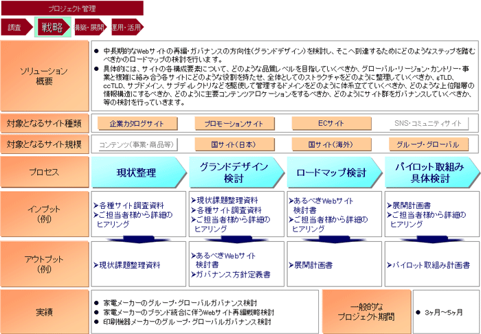 中長期的なWebサイトの再編・ガバナンスの方向性(グランドデザイン)を検討し、そこへ到達するためにどのようなステップを踏むべきかのロードマップの検討を行います。 具体的には、サイトの各構成要素について、どのような品質レベルを目指していくべきか、グローバル・リージョン・カントリー・事業と複雑に絡み合う各サイトにどのような役割を持たせ、全体としてのストラクチャをどのように整理していくべきか、gTLD、ccTLD、サブドメイン、サブディレクトリなどを駆使して管理するドメインをどのように体系立てていくべきか、どのような上位階層の情報構造にするべきか、どのように主要コンテンツアロケーションをするべきか、どのようにサイト群をガバナンスしていくべきか、等の検討を行っていきます。