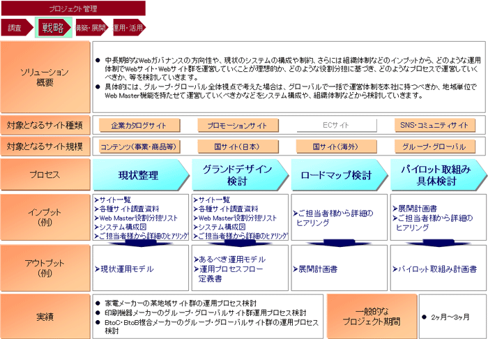 中長期的なWebガバナンスの方向性や、現状のシステムの構成や制約、さらには組織体制などのインプットから、どのような運用体制でWebサイト・Webサイト群を運営していくことが理想的か、どのような役割分担に基づき、どのようなプロセスで運営していくべきか、等を検討していきます。 具体的には、グループ・グローバル全体視点で考えた場合は、グローバルで一括で運営体制を本社に持つべきか、地域単位でWeb Master機能を持たせて運営していくべきかなどをシステム構成や、組織体制などから検討していきます。
